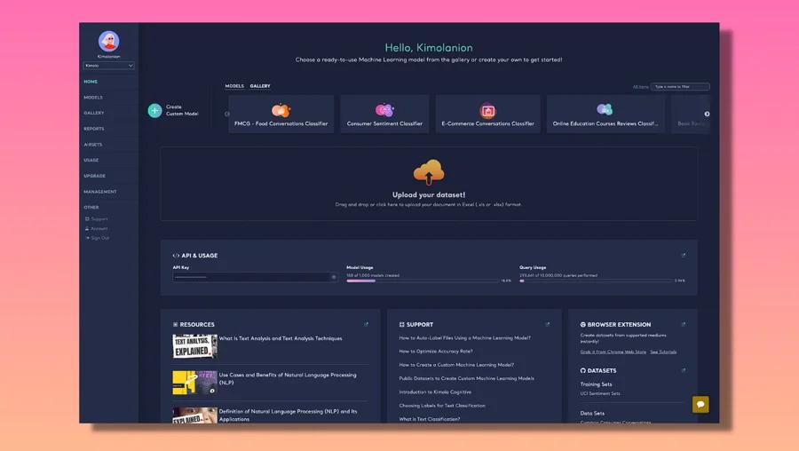 - Pre-built Machine Learning Models: Kimola enables marketing and research professionals to focus their work without worrying about model training, accuracy rates and updated training sets. Just upload your dataset file and start classifying your data automatically.