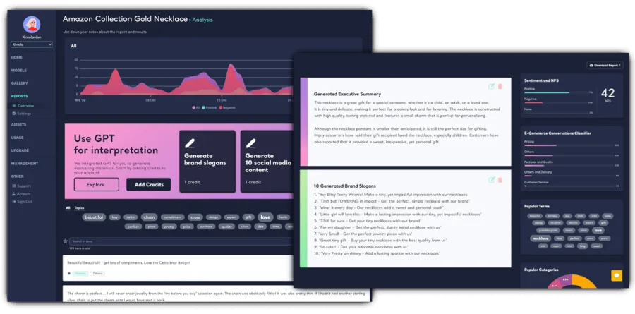 Kimola is a qualitative research tool that operates without the need for coding. It has a free trial for seven days, so feel free to jump on the free trial right away. It can collect and scrape customer feedback with its browser extension and analyze customer feedback by only dragging and dropping the Excel file onto the dashboard. It applies natural language processing (NLP) and machine learning to categorize customer feedback and utilizes GPT technology to create compelling marketing materials; users can develop executive summaries, generate product descriptions and even brand slogans based on their customer feedback. (Who will know you better than your customer, right?)