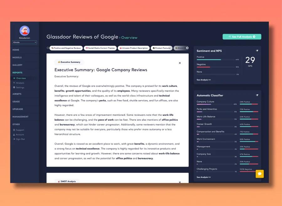Kimola, leveraging NLP technology, "Open-ended questions addressed to employees are an effective method to understand the problems in the workplace and collect various opinions. These questions allow employees to express their thoughts in detail and cover various topics. Multiple label classification is used to better understand and classify the data obtained. Multi-label allows a response to be classified under more than one category or topic. This method is beneficial when employees touch on a wide range of topics. For example, an employee's answer might fall into the "workplace culture" and "communication issues" categories.