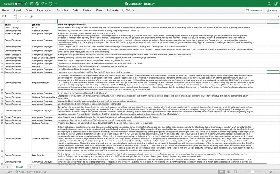 I have acquired a Voice of Employee (VoE) dataset from Kaggle, curated by Nitin Kumar. This dataset compiles Glassdoor reviews about Google, offering insights into employees' perspectives on the positive and negative aspects of working at the company. Here is my dataset: