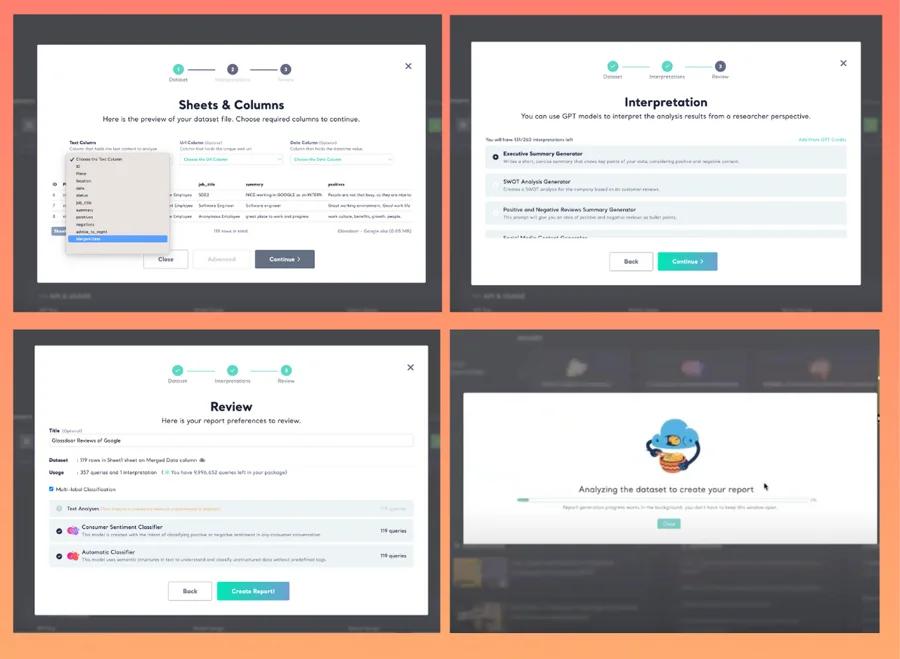 I dragged and dropped the Excel file into the homepage of Kimola, where it says “Upload Your Data”, and chose the text column and executive summary from Interpretation Gallery: