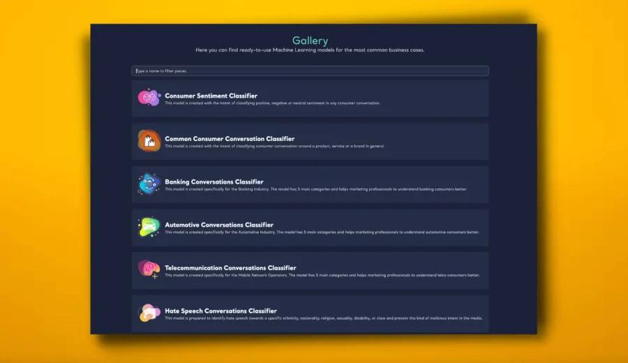 Kimola also offers a free pre-built models gallery that you can test it and use it for free to classify customer feedback in different sectors.