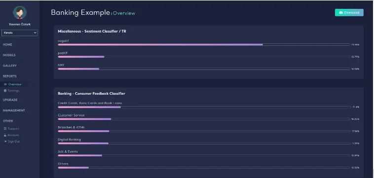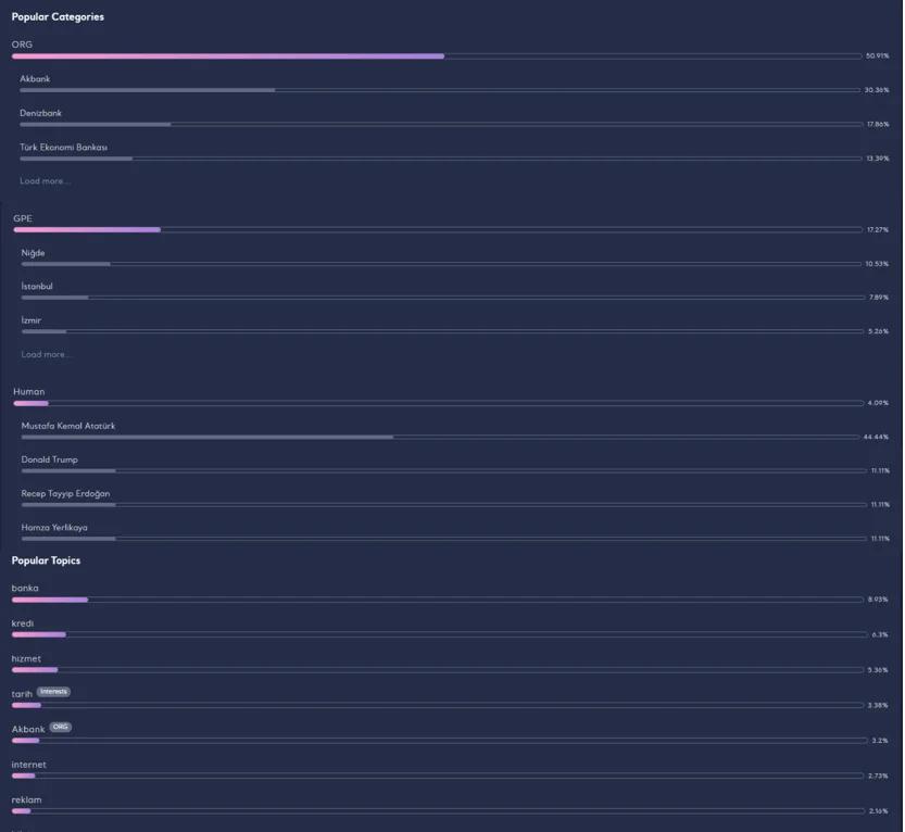 In addition to the machine learning technology it uses, Kimola also uses Named Entity Recognition technology, a natural language processing application, in the analysis of social media data. (If you want to learn more about the definition of Named Entity Recognition and what it does, you can check out this article). This technology provides easy identification of named entities such as person, place, and location from a large number of data sets. For example, by detecting the city, district, and similar location assets in a data set belonging to Bank A, it can be quickly determined which branches of that bank are the subject of consumer conversations, and it becomes possible to take action regarding the relevant situation. Additionally, it also allows you to quickly take a look at what popular concepts are covered in your dataset. In addition to viewing the results of the analysis from the interface of Kimola, you can also download the report of the analysis to your computer as an Excel document by using the "Download" button.