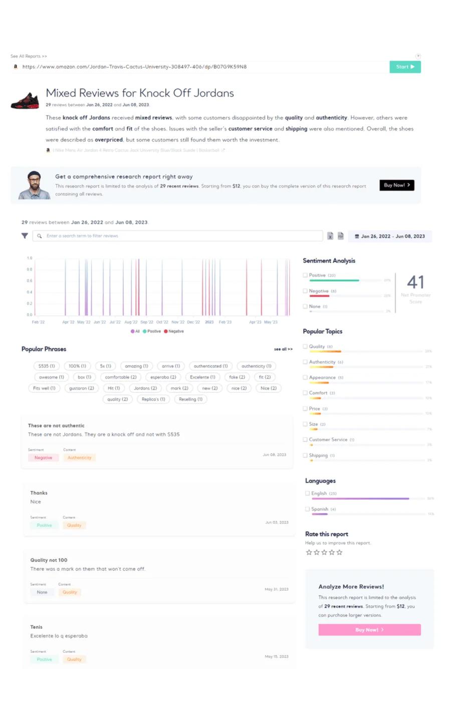 Here is the report of the reviews for "Knock Off Jordans" on Amazon. The report includes both positive and negative reviews, the Net Recommendation Score, content analysis, as well as prominent topics in customer feedback. In this context, we observe that our customers share their experiences regarding the quality, authenticity, and appearance of our shoes.
