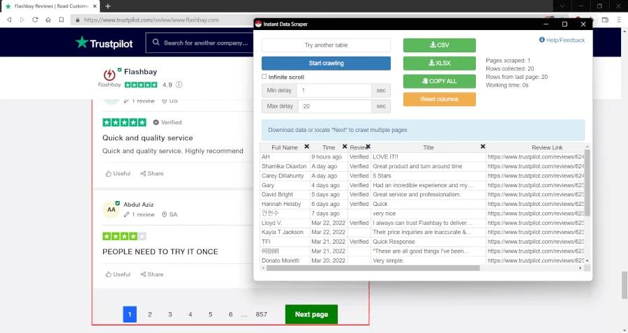 Let's say you need to scrape reviews of a company that has a page on TrustPilot. Unlike Google Play Store, TrustPilot displays reviews on multiple pages rather than an infinitive scroll option. After opening the Instant Data Scraper window by following the same steps I mentioned above, all you need to do is make sure that the "Infinite scroll" option is unchecked and then click the "Locate 'Next' Button" button. When you click the "Next" button on the open website, the extension will detect the button automatically, and when you start the scraping process, it will automatically perform this process and scrape all the data.