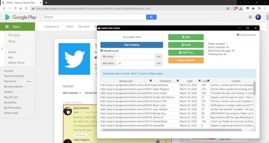 Google Play has a user interface design that allows you to scroll infinitely. In order to scrape all the data on such websites, all you need to do is check the "Infinite scroll" option on the extension and then click on the "Start crawling" button; the extension will start scrolling Twitter's Google page automatically and scrape all the data.
