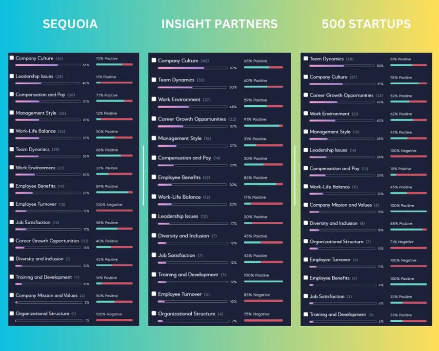 In this post, we turn our focus to the investment landscape, viewed through the lens of employee experiences. We have thoroughly analyzed Glassdoor reviews of various investors (some attending Slush) to unearth valuable insights with Kimola. These findings are crucial for attendees, as they illuminate the workplace culture and employee satisfaction at these investment firms. Such insights are indispensable for those seeking investment partners or opportunities, helping them make well-informed decisions. Join us as we highlight the investors who excel in these domains and explore what makes them standout partners in the flourishing startup ecosystem.