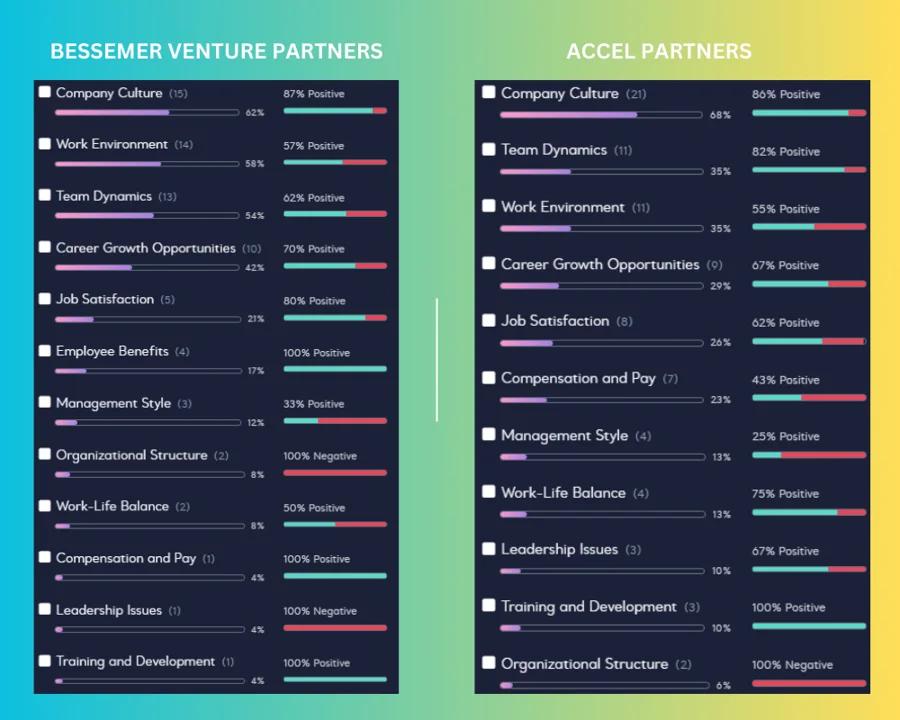 Accel Partners: Offers great learning opportunities and support, though some employees have highlighted concerns with career clarity and a highly competitive culture.