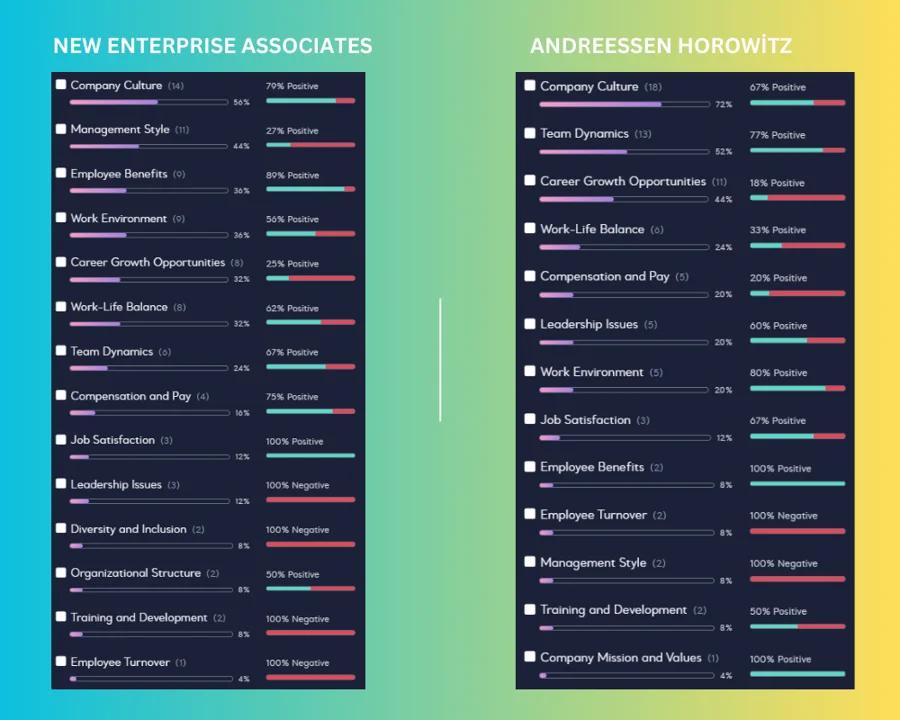 Andreessen Horowitz: Offers a stimulating environment with valuable perks, but some note challenges around career progression and work-life balance, leading to occasional burnout.
