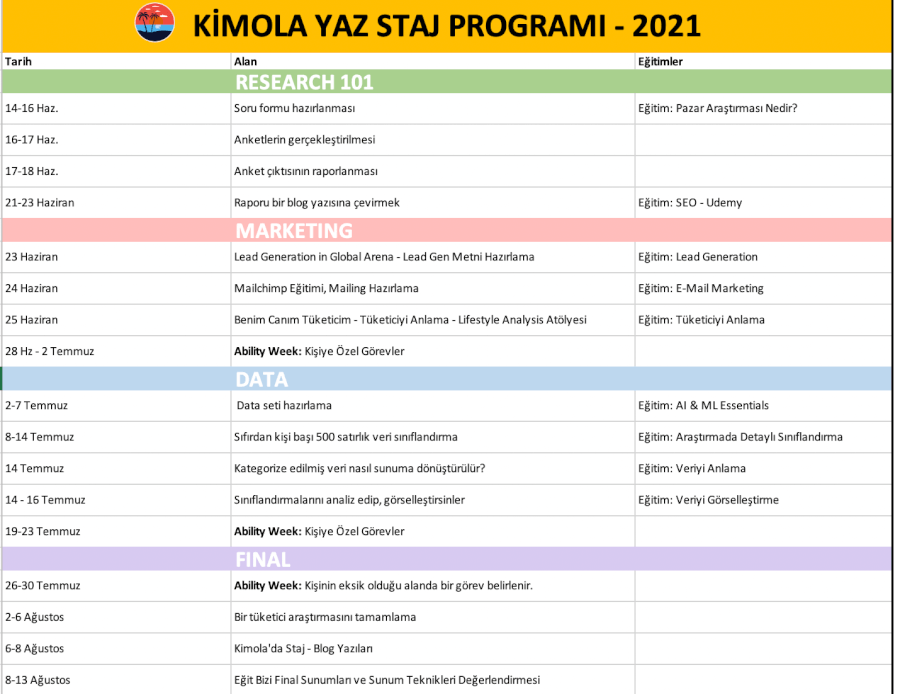 Örnek olması için 2021 yılında yaptığımız staj programımızın eğitim programına göz atabilirsin: