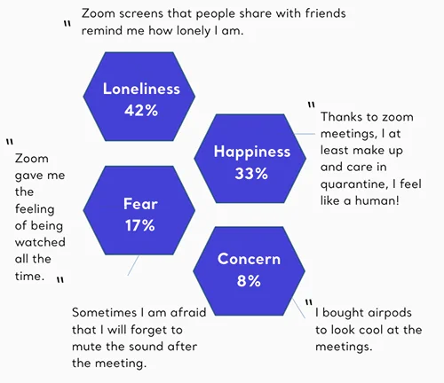 We also discovered some conversations of ZOOM users that share how they feel while using the app. Sharing screenshots of chats with crowded groups of friends on social media makes some users feel lonely. On the other hand, the app turns into great enthusiasm and happiness for some users because meetings motivate people to be well-maintained.