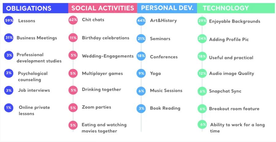 The other important thing while categorizing conversations is understanding the deeper motivations of customers. If we can understand their motivations deeper, we can enlarge our communication plan through those motivations. ZOOM lovers have five main motivations to use the app. The audience has to use Zoom for their obligations, such as lessons, meetings, interviews. Apart from that, users who try to maintain the feeling of togetherness during the quarantine period perform various activities through the application. Some users prefer to participate in multiple seminars, interviews, and conferences for personal development during this period.