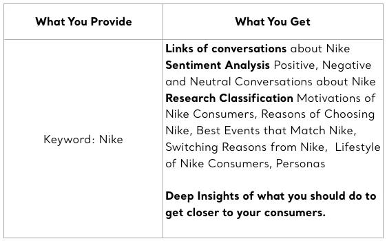 Let’s return to our case. When you use Kimola to do social research about your brand Nike, you still get all the data we’ve mentioned in social monitoring and listening, plus some additional categories like motivations of Nike consumers, reasons of choosing Nike, best events that match Nike, switching seasons from Nike, lifestyle of Nike consumers, so forth and so on. This is the data you'd gather when you do broad social research.