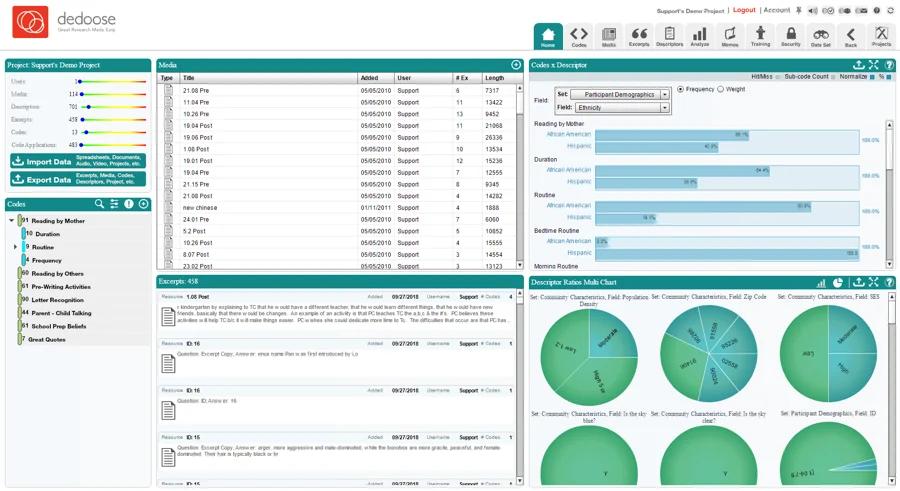 Dedoose is a cross-platform cloud-based application that helps to analyze qualitative data and data from mixed methods research. It allows you to import data from different sources: Audio files, Video files, Text, Images, Surveys, and Assessments. As a cloud-based application, it offers broad accessibility, can be accessed from mobile devices and provides collaboration features such as simultaneous collaboration and control of access privileges. You can also visualize your data in the form of graphs, tables or drawings and export these files to your local storage.