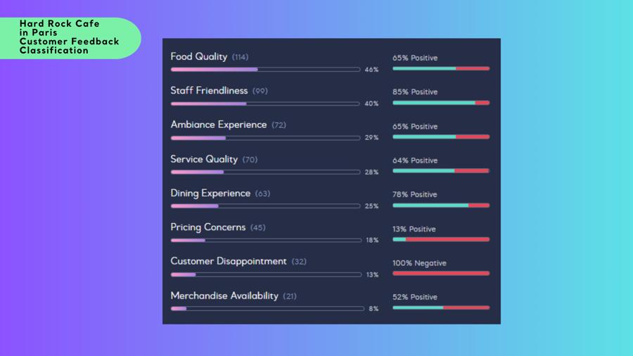 To understand how customers perceive Hard Rock Cafe’s most iconic locations, we conducted a Customer Feedback Analysis using Sentiment Analysis, Text Analysis, and Qualitative Research. Instead of relying on traditional surveys, we leveraged real-time consumer opinions by analyzing a total of 1500 reviews—250 from each of six major locations: London, Orlando, New York, Las Vegas, Paris, and Tokyo—gathered from Google Business. By using Kimola, we were able to process large volumes of unstructured data efficiently, identifying key themes and sentiment trends through Natural Language Processing (NLP) and Named Entity Recognition (NER).