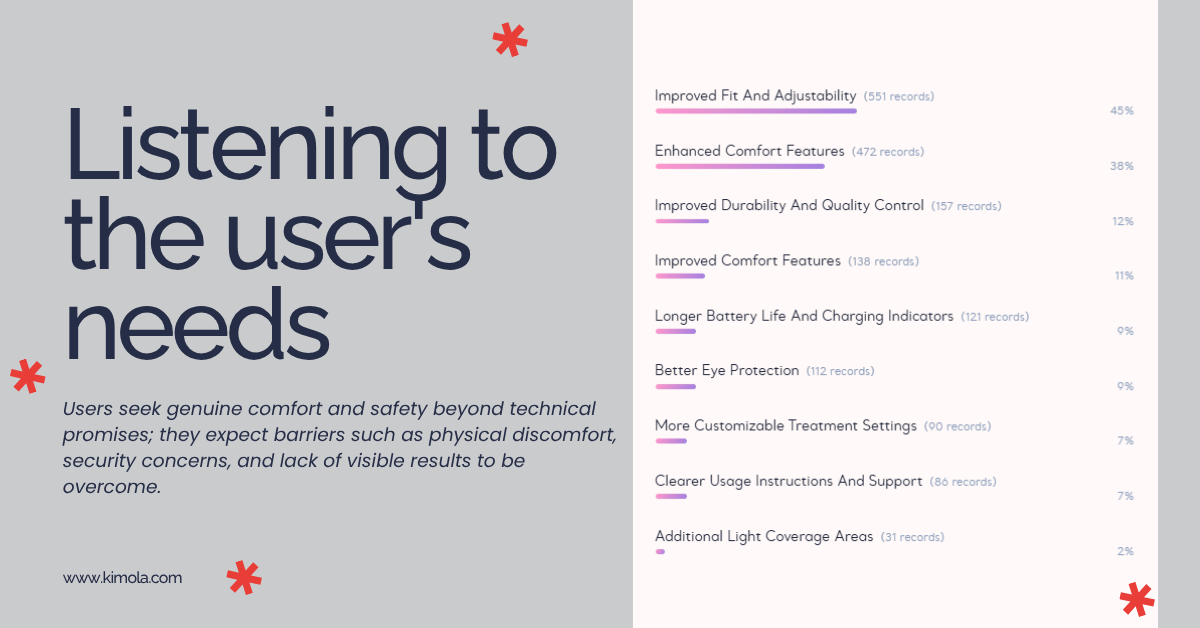 Customer feedback may seem like just a personal story when viewed individually, but when thousands of experiences are combined, Deconstructed patterns emerge that go beyond individual comments. Insights such as the "evidence gap" or "ergonomic resistance" we observe in the LED face mask category are actually evidence that thousands of users converge on a common language of experience. Being able to view these patterns in a scalable way is the only way to understand not only what the market buys, but how it integrates that product into its life.