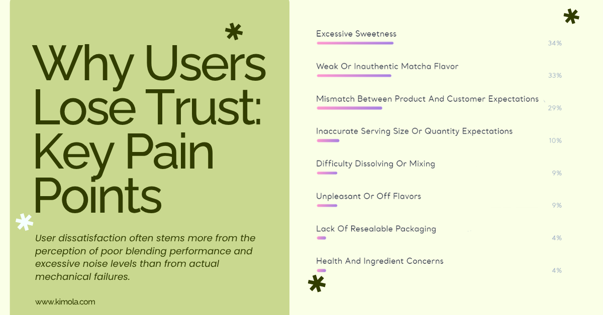 Similarly, 24% of users are habitual drinkers who view matcha as a coffee replacement. They value sustained energy without the crash, but their primary frustration lies in packaging integrity. For this group, broken seals or non-resealable bags that compromise the freshness of their daily staple are a primary reason to switch brands.
