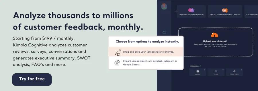 Looking for an AI-based tool to analyze customer feedback? Experience how Kimola turns online customer feedback into insights. Contact sales