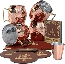 The Hammered Moscow Mule Copper Mug Set of 4 has garnered mixed reviews from customers. While many appreciate the beautiful design, stainless steel lining, and thoughtful packaging that includes leather coasters and a shot measure, there are significant concerns regarding the durability of the handles. Multiple reviews mention defective handles, with several customers reporting that handles either fell off or arrived broken. Overall, the mugs are praised for retaining their shine and providing a pleasant drinking experience, but potential buyers are advised to inspect the handles immediately upon arrival. Overall, the product shows promise, yet quality control issues need addressing.