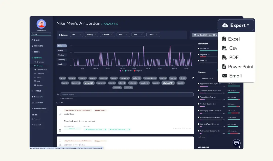 Export social media feedback to Powerpoint, Excel and PDF easily with Kimola.