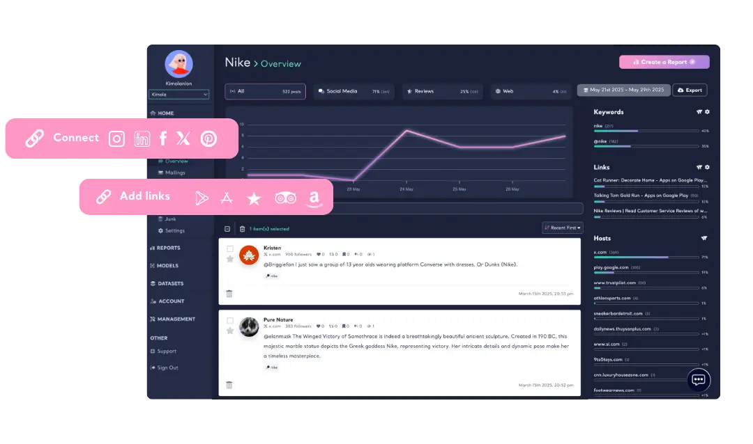 Kimola enables businesses to track mentions using Keyword Tracking, monitor online discussions through Link Tracking, and upload existing datasets in Excel, CSV, or TSV formats for structured analysis. This ensures all relevant feedback is gathered in one place for seamless insights.