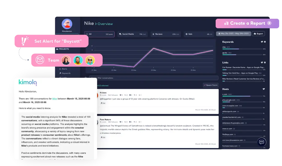 Yes. With Automated Reports & Alerts, Kimola delivers real-time updates on brand mentions, influencer involvements, and data spikes directly to your inbox, so you don’t have to track conversations manually.