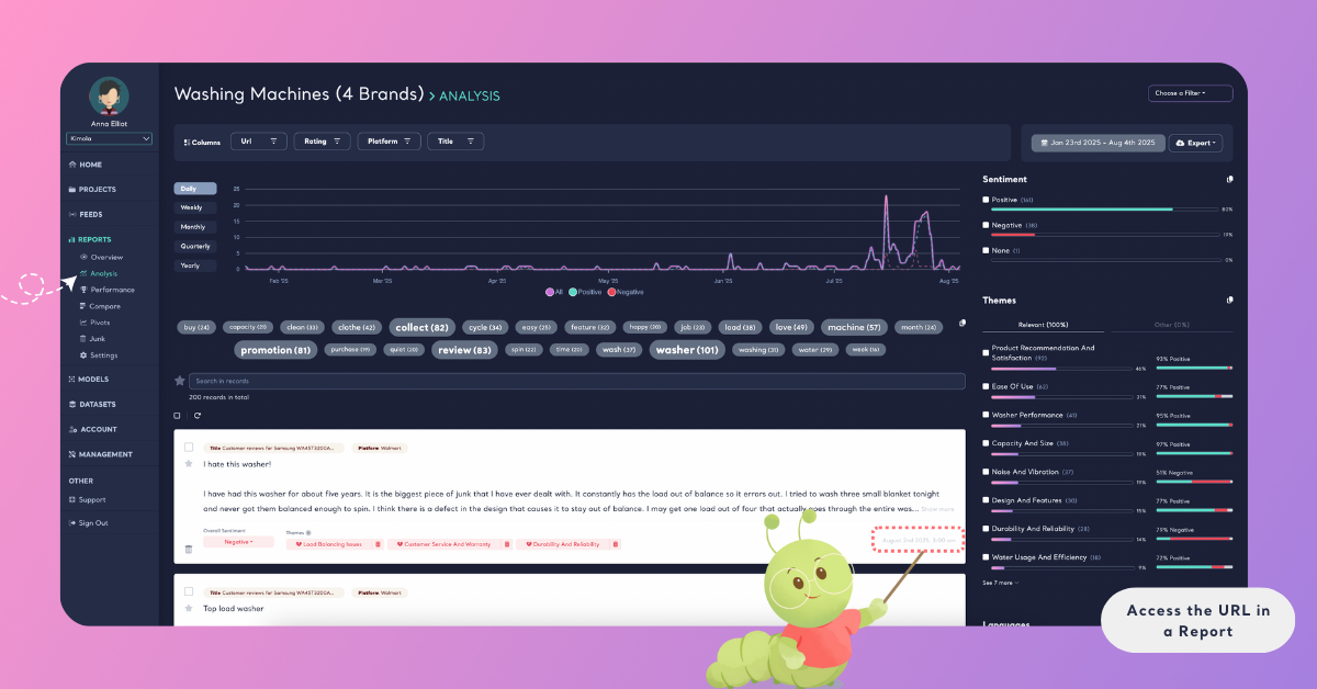 By using source URLs in reports, you can easily move between structured analysis in Kimola and the original feedback context, making it easier to validate insights and support deeper investigation when needed.