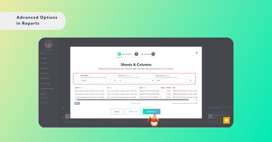 Identify and select columns crucial for your analysis, such as reviews, URLs, and dates, then choose the "Advanced" option.