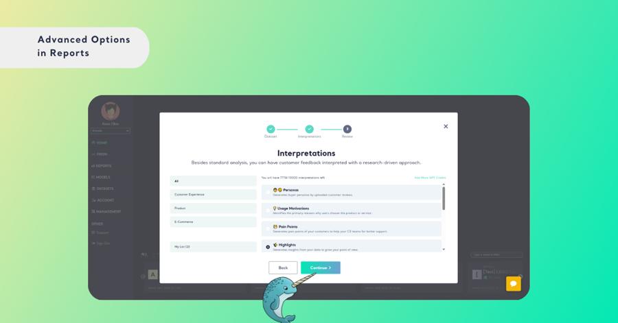 In the interpretation section, dive into insights like Buyer Personas and Usage Motivations. Select these or skip directly.