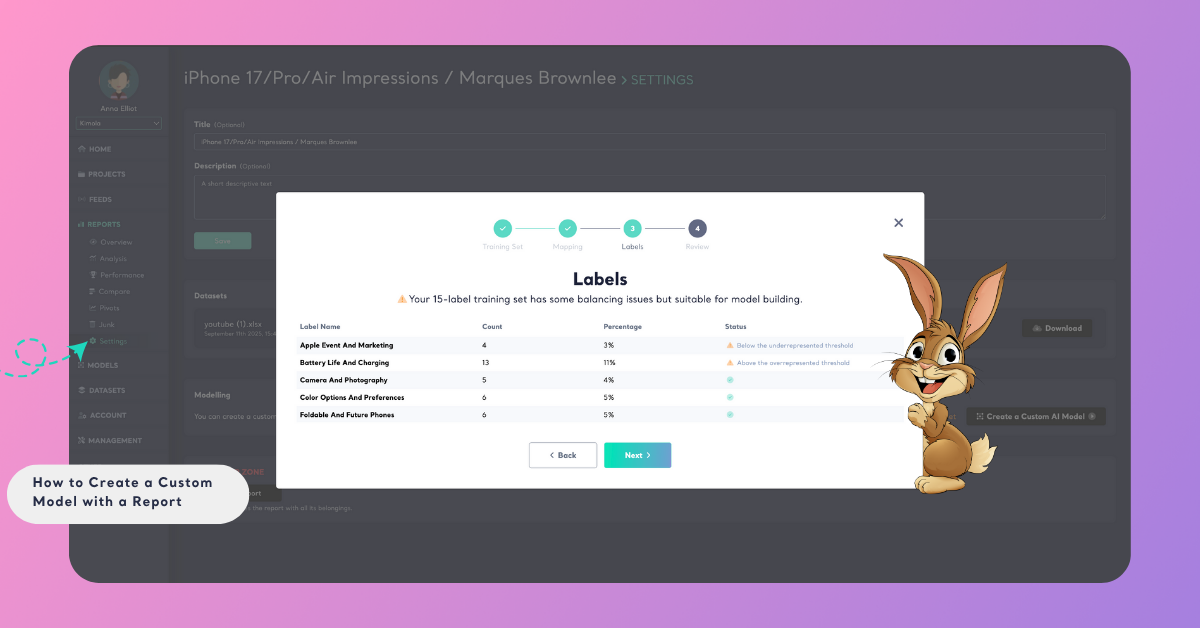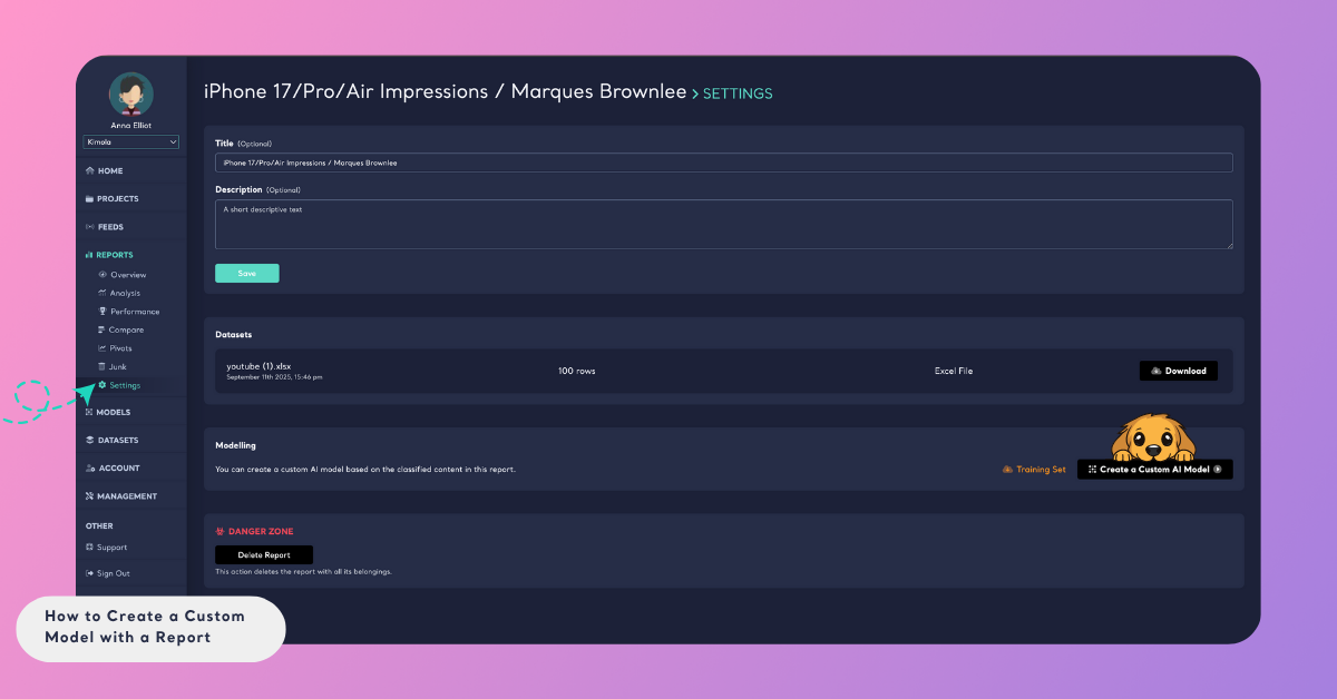 To get started, log into your Kimola account and open your dashboard. In the left panel, click Reports, find the report that contains the labels you want to use, and open its Report Settings page. In the Modelling section, click Create a Custom AI Model to start building your model.
