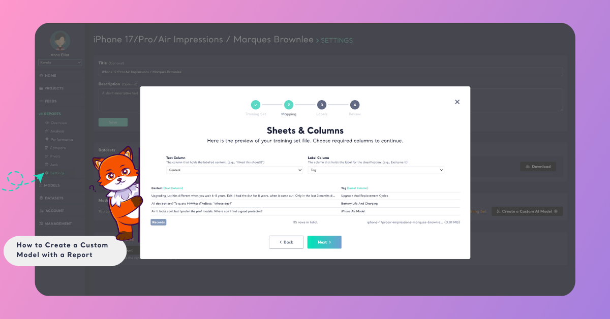 4 mins read - Created on Oct 24, 2025In Kimola, a report is where you analyze and categorize text data such as customer feedback, survey responses, or social media comments. If you’ve already labeled or tagged data inside a report, you can turn that labeled data into a reusable AI system — called a Custom Model — without starting from scratch.