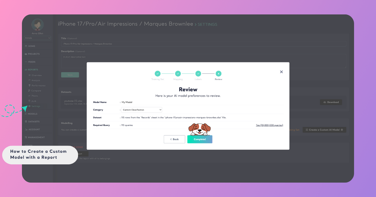 Once everything looks correct, click Complete to start training. Kimola will process your data in the background and notify you via email when your model is ready.