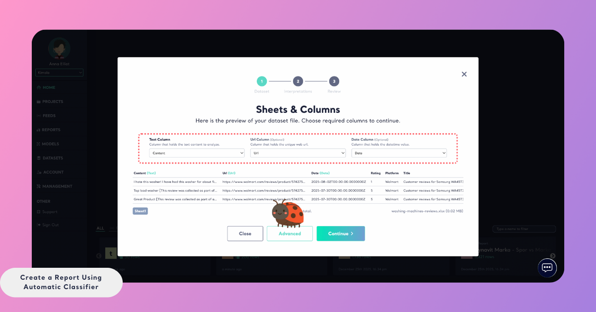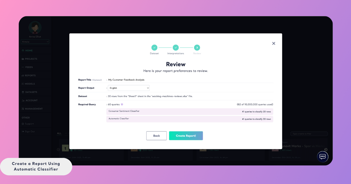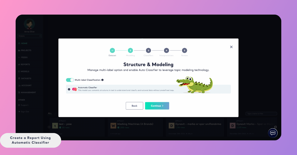 5 mins read - Updated on Dec 29, 2025The Automatic Classifier in Kimola allows you to analyze datasets without creating or training a model in advance. This means there is no need for data annotation, manual labeling, or a separate training process before generating a report.