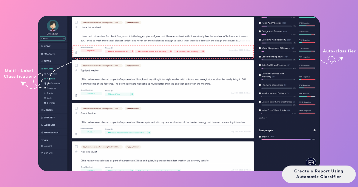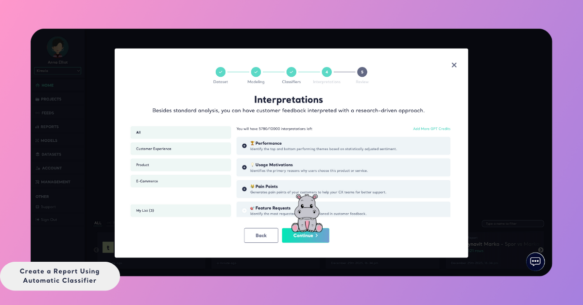 When the Automatic Classifier is enabled, Kimola applies its Dynamic Classification™ technology to the dataset during report creation. The system analyzes the context of the text, identifies meaningful patterns, and automatically groups related feedback into themes with relevant label names. These themes are generated dynamically based on the content itself, rather than relying on predefined tags or a fixed taxonomy.