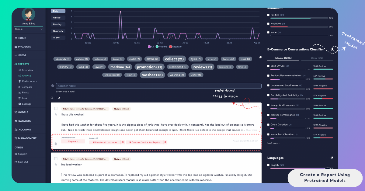 5 mins read - Created on Dec 25, 2025Pretrained models in Kimola allow you to analyze your data using ready-to-use classification models that are trained for specific industries, domains, or common business use cases. These models are designed to help you get structured insights quickly, without creating or training a model yourself.
