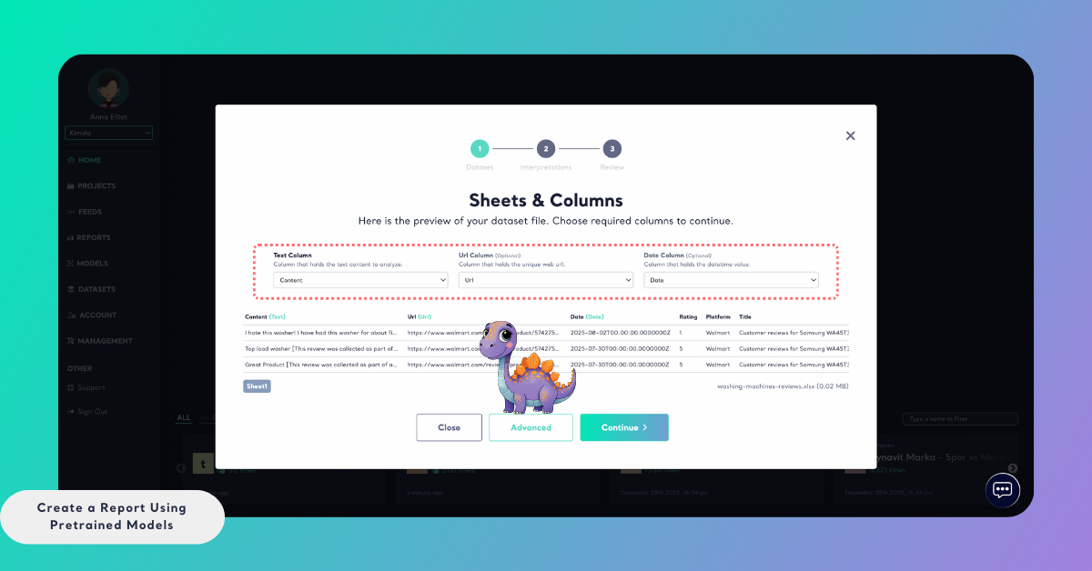If you uploaded a custom dataset, you need to map the required columns so Kimola can process the data correctly. Select: