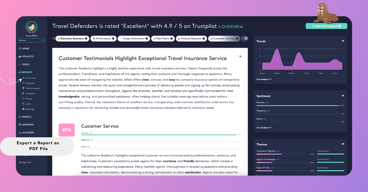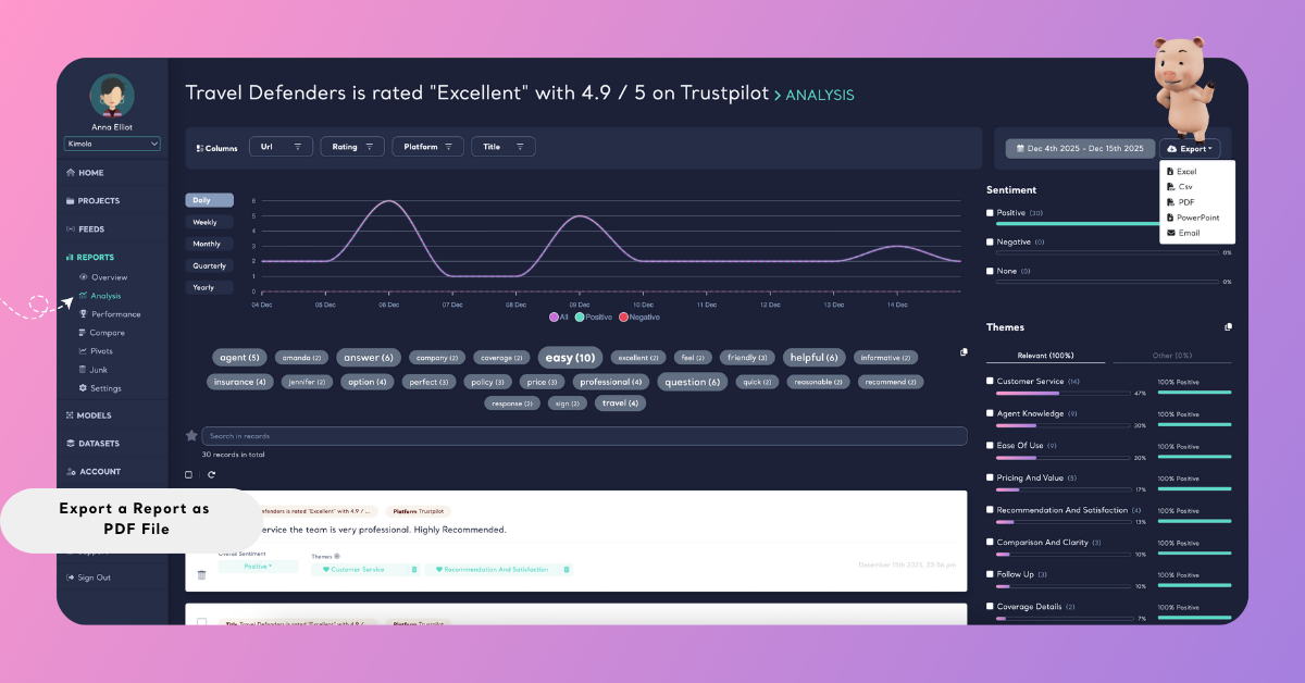 Kimola creates a PDF file that mirrors the report exactly, including the available analysis visuals and summaries.