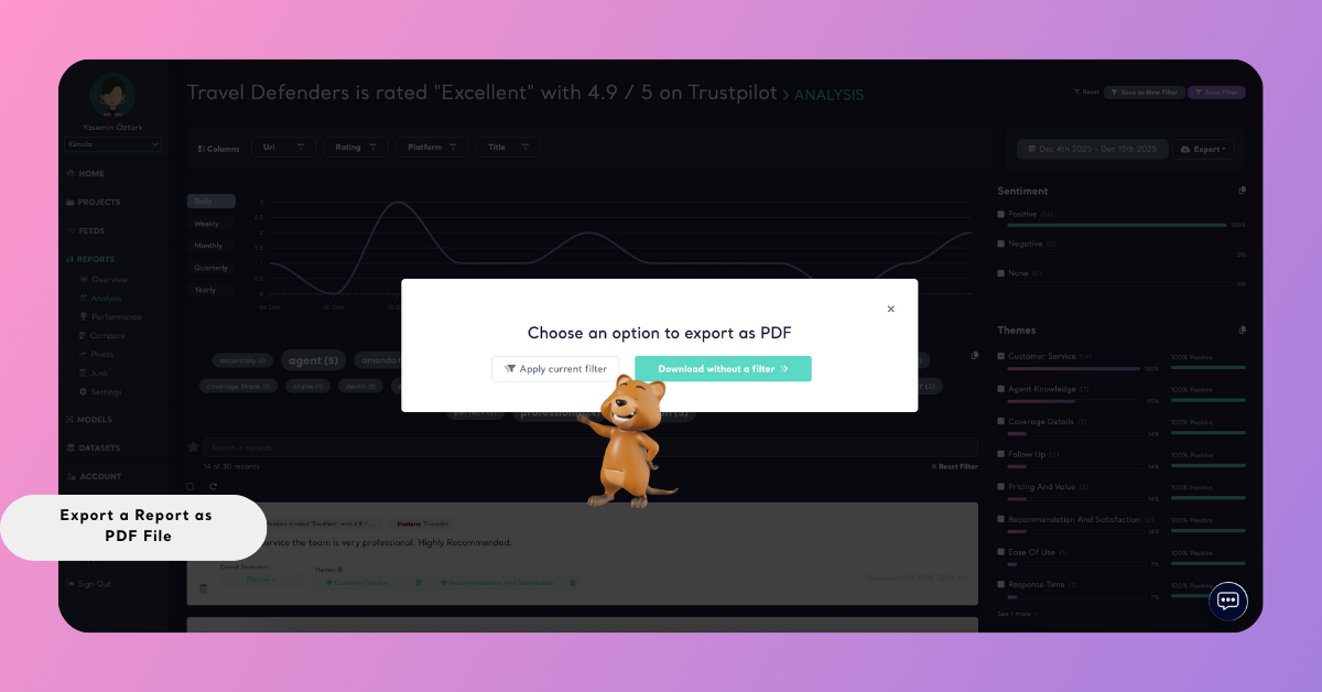 If your report includes active filters (such as date range, attributes, language, or themes), Kimola lets you decide whether these filters should be reflected in the exported PDF.