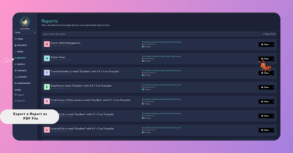 Sign in to your Kimola account and open the Reports section from the left menu.