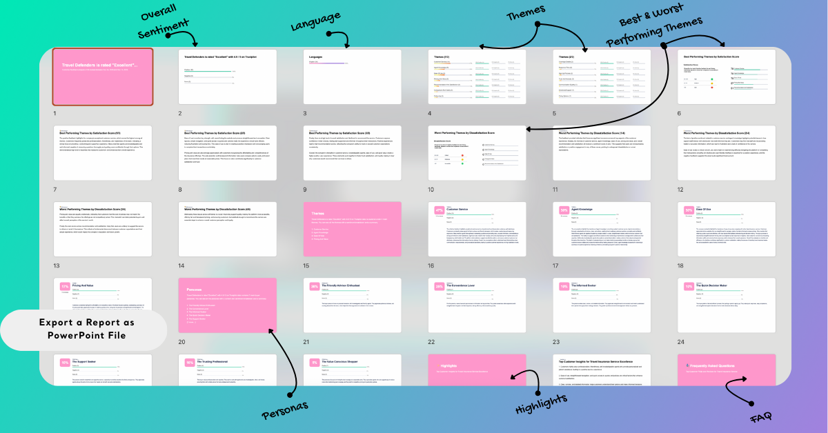 The presentation also includes theme-based analysis slides, where records are grouped under topics or labels. These slides help you identify recurring themes, common issues, or frequently mentioned strengths within the data.