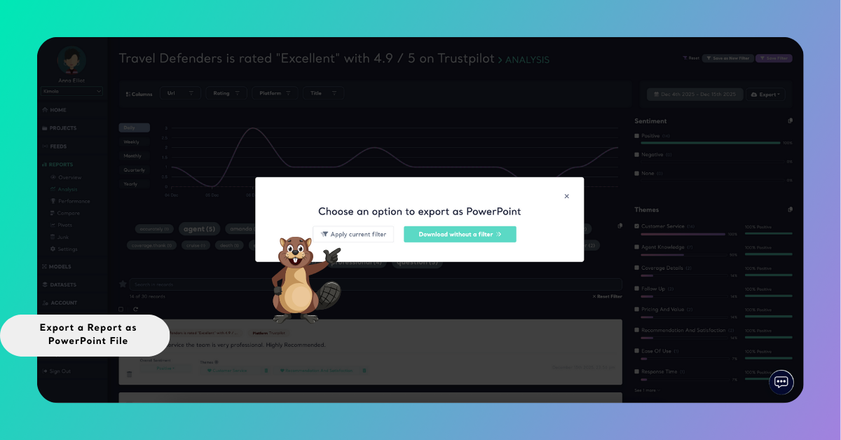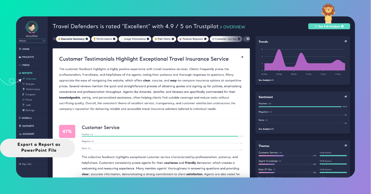 Exporting reports as PowerPoint files helps you quickly turn analysis results into clear, shareable presentations. With ready-to-use slides covering sentiment, themes, and key insights, you can focus on communicating findings rather than recreating visuals. PowerPoint exports are especially useful for stakeholder meetings, executive briefings, and client presentations, allowing you to present Kimola insights confidently and efficiently.
