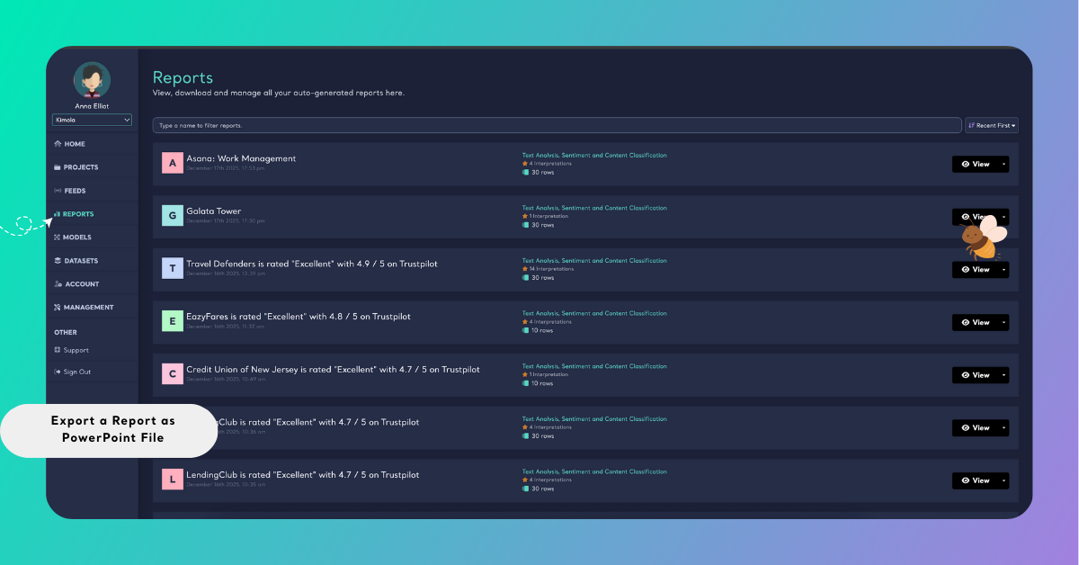 Kimola generates the presentation based on the report’s current analysis and applied settings.