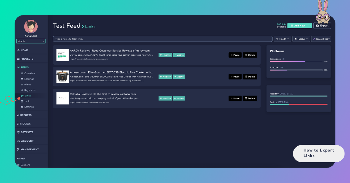 1 min read - Updated on Oct 09, 2025Exporting links in Kimola lets you download all tracked URLs in Excel format.
