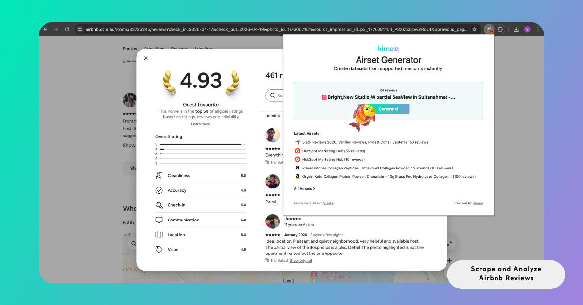 Manual scraping allows you to collect Airbnb reviews directly while browsing listing pages using Kimola’s browser extension. To support this workflow, Kimola provides its browser extension, Airset Generator, which captures reviews across supported platforms and stores them as datasets in your Kimola account.