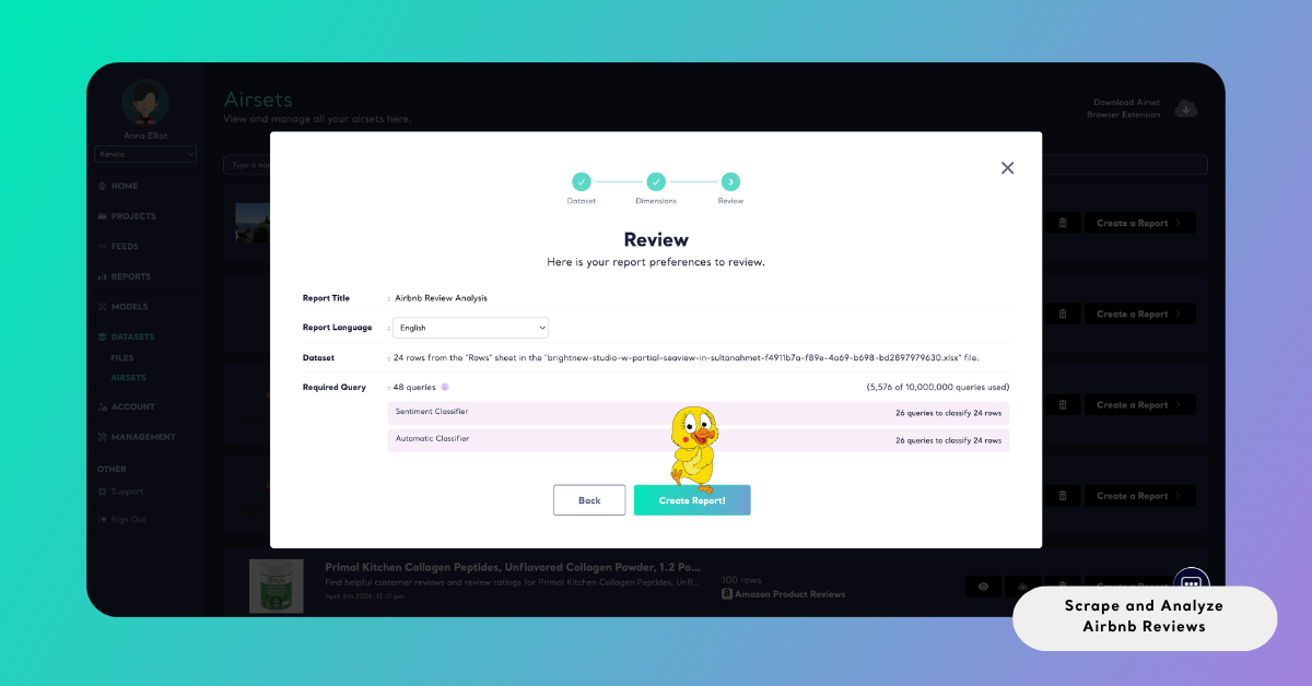 Airsets allow you to store scraped reviews before analysis. This makes them especially useful when working on larger research projects or when collecting feedback across multiple listings, locations, or stay types over time. Instead of analyzing everything immediately, you can first gather and organize your data, then decide later which dataset to analyze by creating a report.
