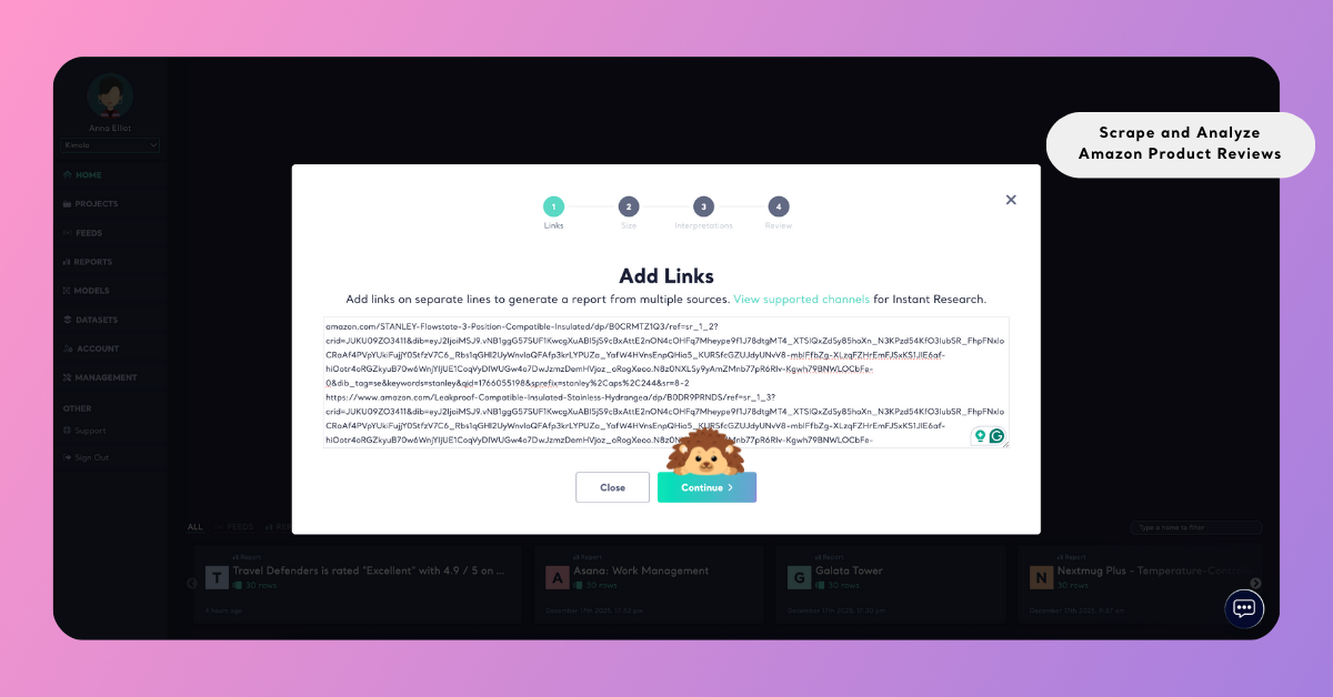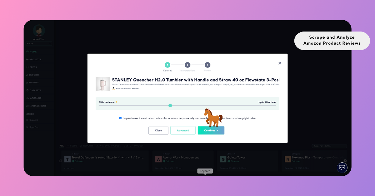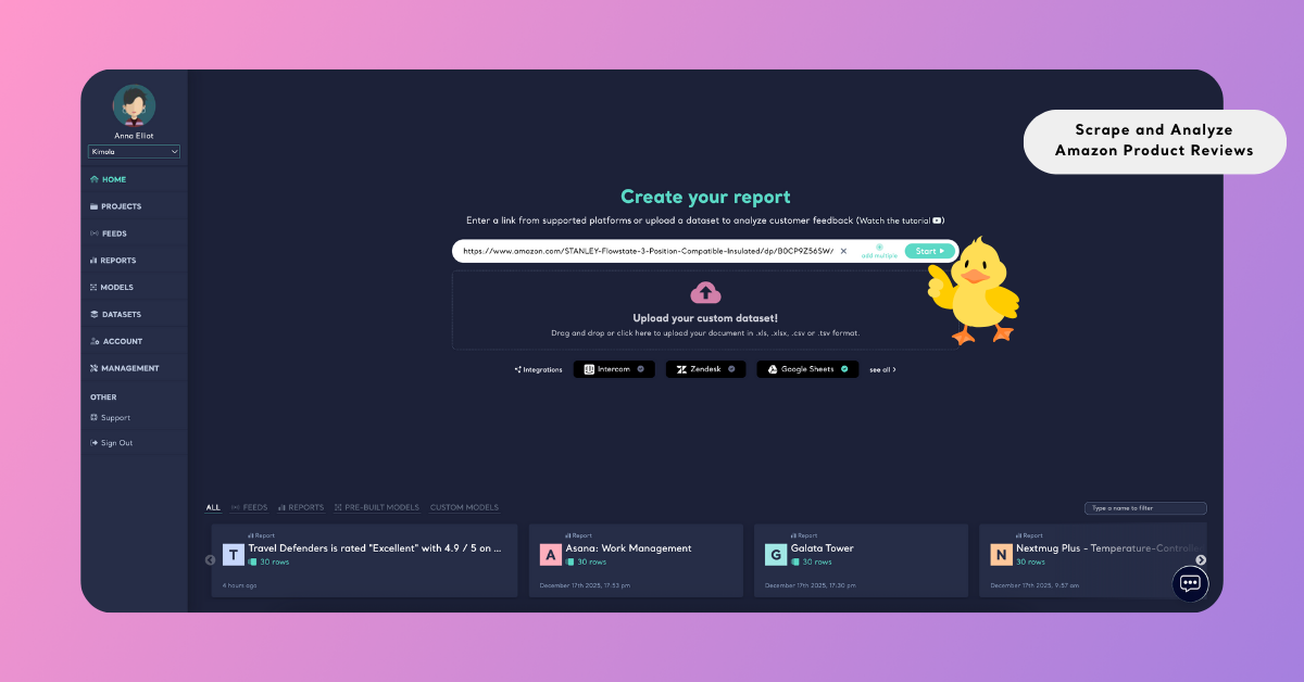 When you enter an Amazon product link, Kimola automatically collects publicly available customer reviews from the product page, builds a dataset in the background, and analyzes the data based on your selected report settings. All steps — from data collection to analysis — are handled automatically.