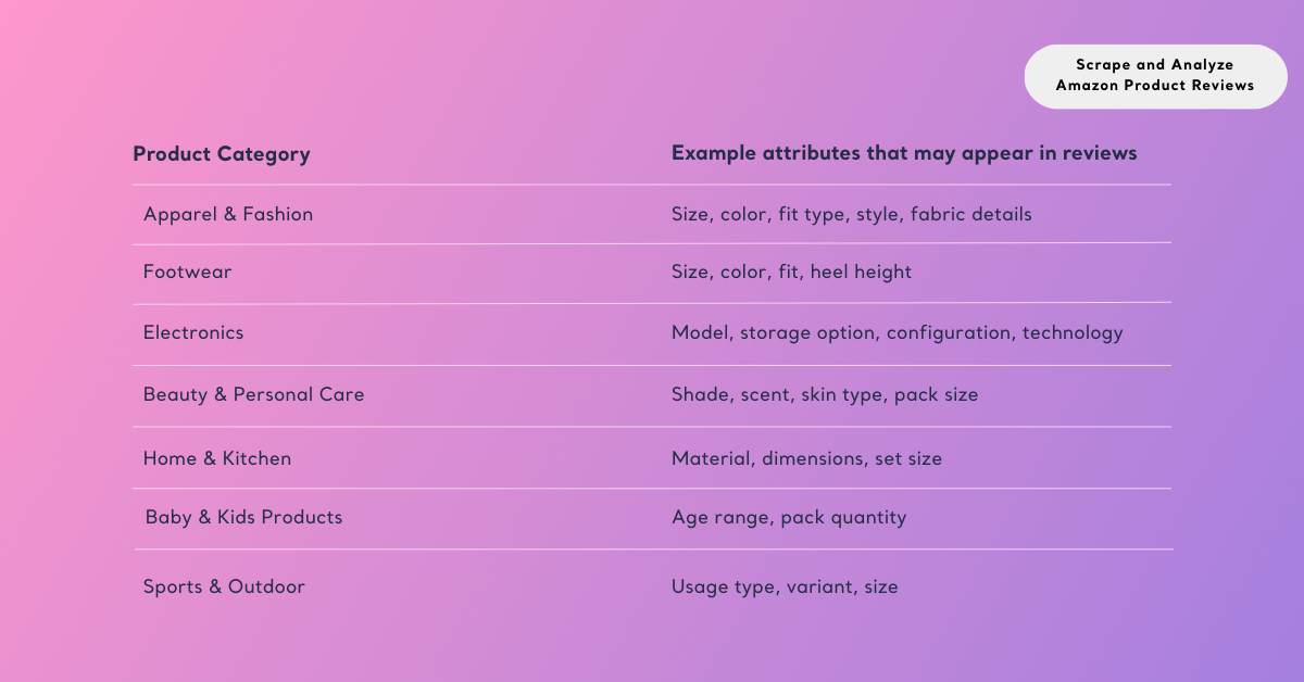 While auto-scraping Amazon product reviews, Kimola also collects product-specific attributes other than basic fields like review content, rating, url, and date depending on the product category and selected variations.