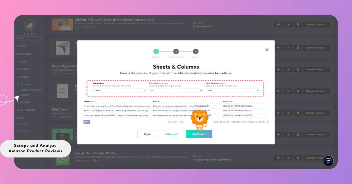 This action initiates Kimola’s standard report creation workflow. Select the column that contains the primary review text, and optionally include date and URL columns if they are available. These selections define the structure of the dataset used for analysis.