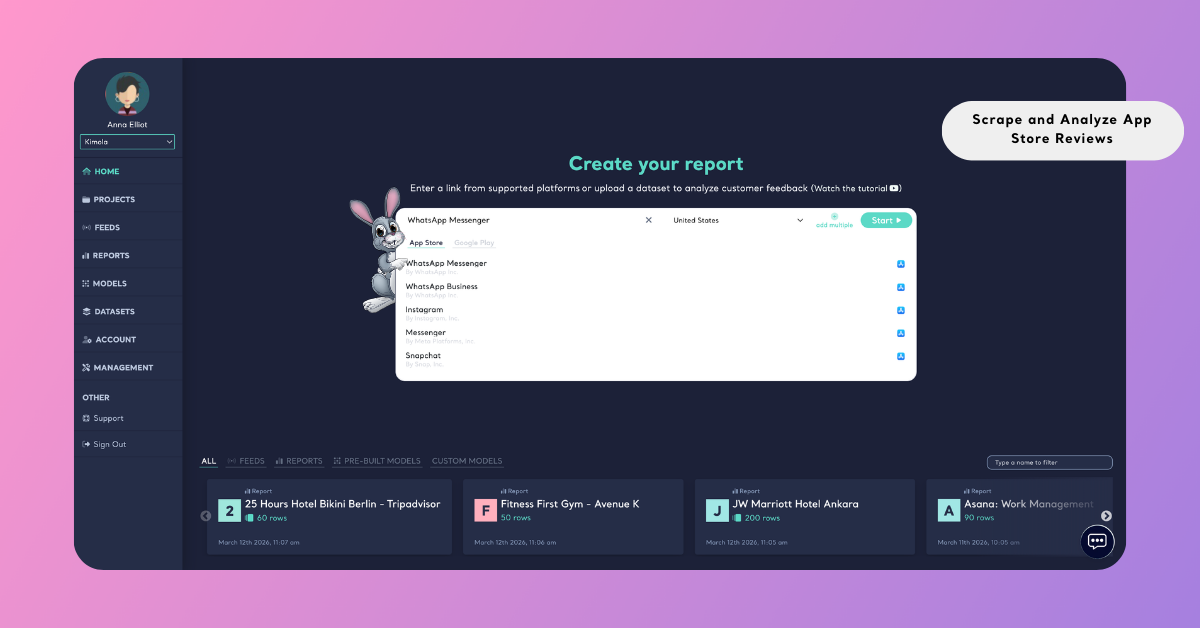 Alternatively, you can start scraping by searching for the app directly from the Create your report section on the Kimola Dashboard home page. Simply enter the app name, select the desired country storefront, and continue to generate the report.