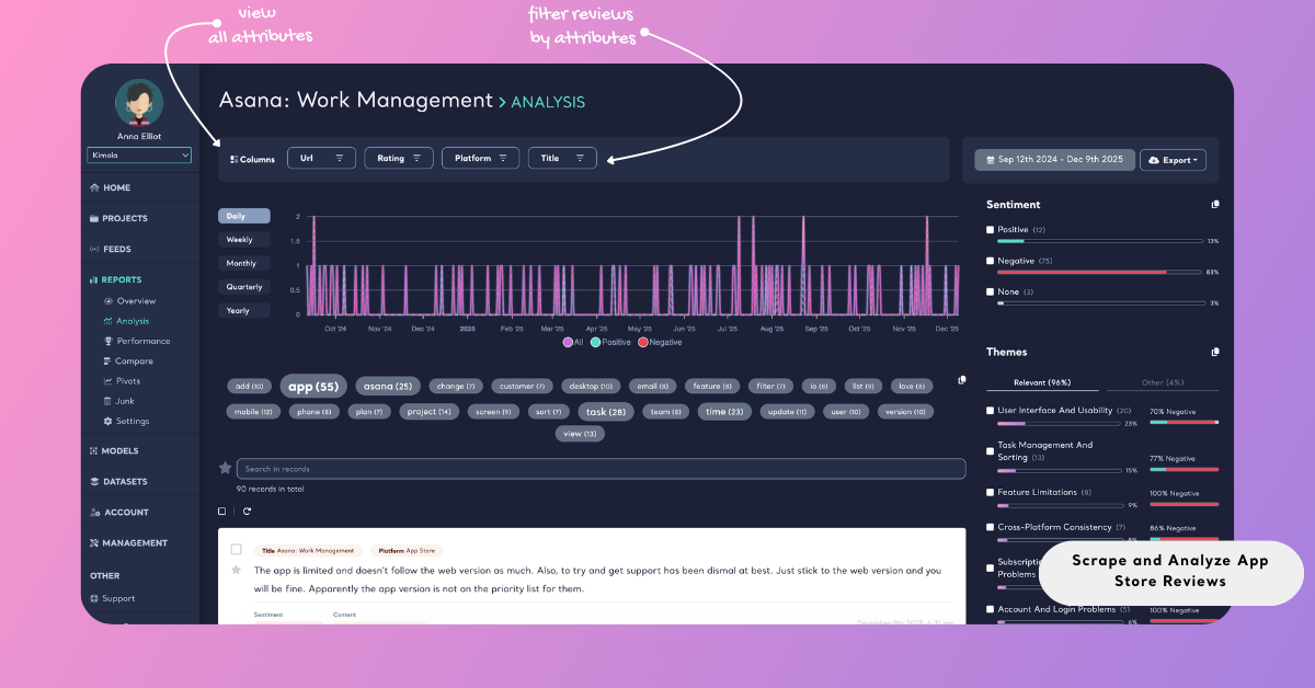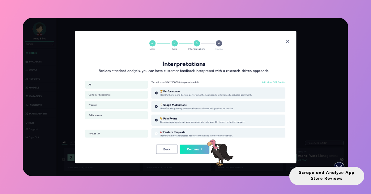 In addition to standard sentiment analysis and classifications, Kimola allows you to apply higher-level interpretations to App Store reviews. These interpretations help identify patterns such as common usability issues, feature requests, user expectations, and feedback related to app updates.